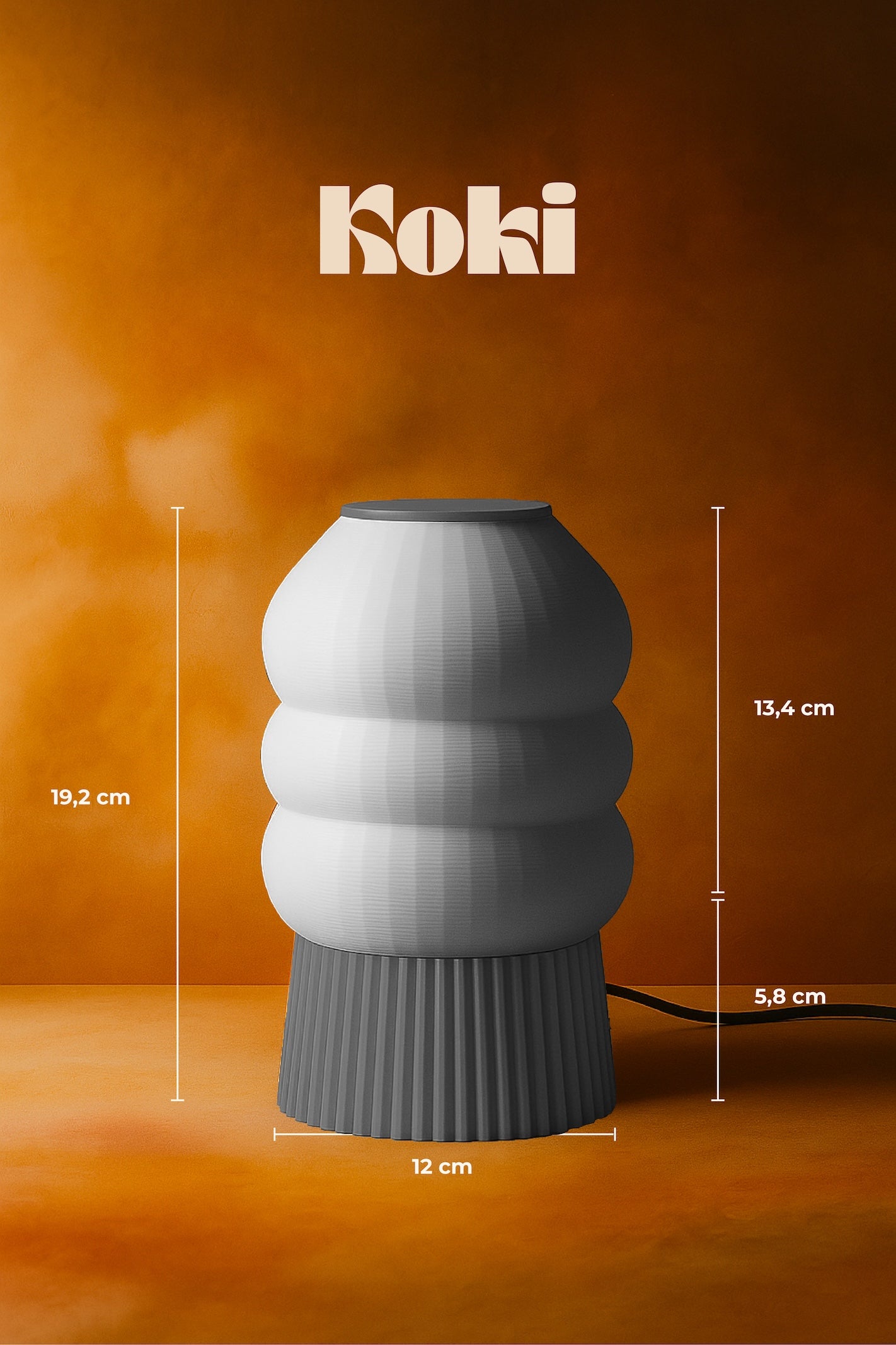 Pensée comme un objet de design intemporel, la lampe KOKI s’intègre aussi bien dans un intérieur minimaliste que dans un espace plus expressif. Son aspect texturé, résultat du processus d’impression 3D, raconte l’histoire de sa fabrication — une empreinte visible, entre artisanat et technologie.